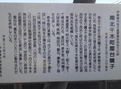 正面鳥居の右隣にある「南北千木町屋台囃子」の屋台庫(写真左)と案内板(同右)