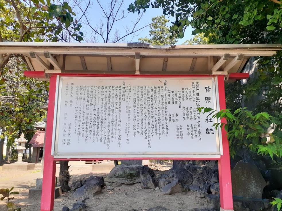 鳥居の右側に建つ社号標柱 社号標柱の後方に設置されている案内板
