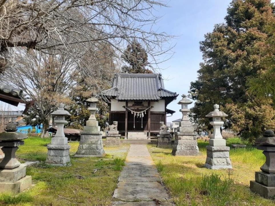左から、琴平・菅原神社、稲荷神社、厳島神社、神明社、羽黒様、熊野神社、諏訪神社、三島神社、菅原神社。嘗ては耕地ごとに神様を祀っていて、下新田は熊野神社、東新田は羽黒山、堀之内は誠訪社、馬御屋は三島社を祀ったとの事。