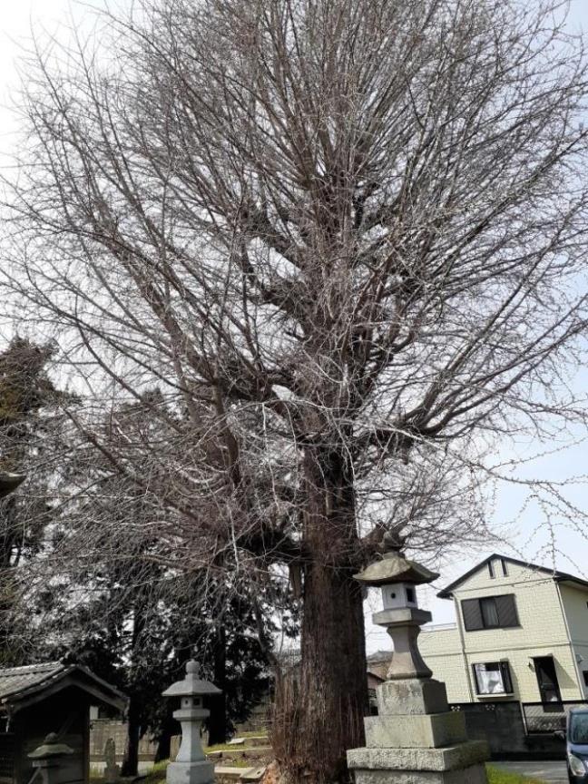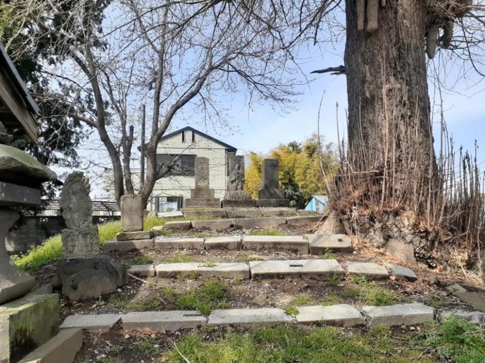 合祀社の先には数多くの庚申塔や石碑がある。 境内に聳え立つイチョウの古木
