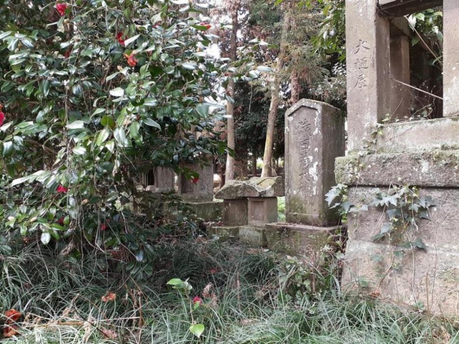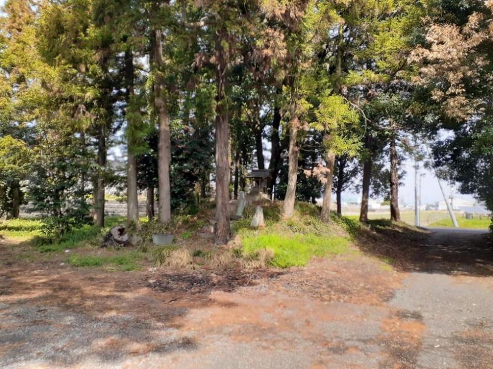 社殿手前で右側には合祀社や石祠・末社等が祀られている(写真左)。一番右側にある社は狐の置物があるので稲荷社である可能性があるが、その他は詳細不明。また境内一番北側にある塚上に祀られている社(同右)は『明和村の民俗』に載せられている富士岳(富士塚)であろうか。