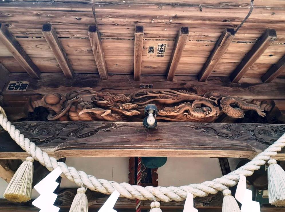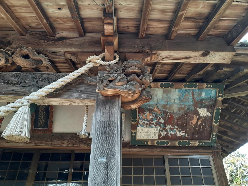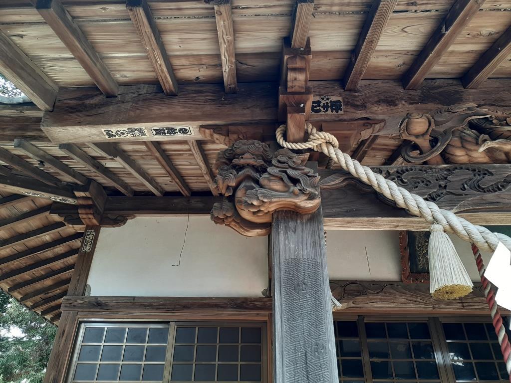 拝殿の向拝部、及び木鼻部には精巧な彫刻が施されている(写真上部、及び下段左・右)