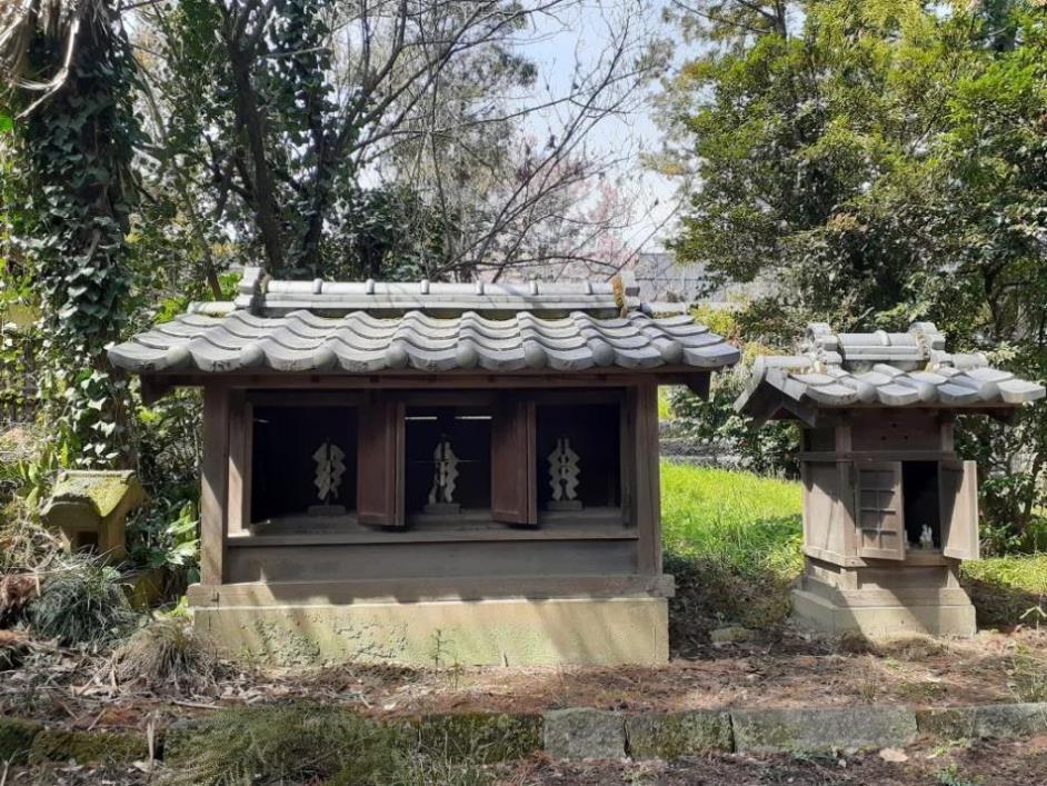 社殿左側には境内社(写真左)、石祠4基・及び猿田彦の石碑(同右)が祀られている。