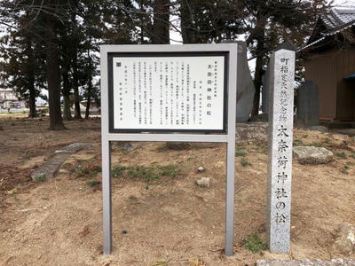 太奈荷神社拝殿前の松を一号樹、社殿西にある松を二号樹として指定しました。一号樹は、目通幹囲三・八二メートル、根本幹囲五・三九メートル、株周九・八メートル、樹高二十六・五メートルを計ります。