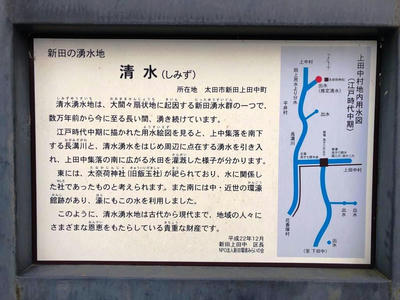 このように、清水湧水地は古代から現代まで、地域の人々にさまざまな恩恵をもたらしている貴重な財産です。(以下略) 案内板より引用