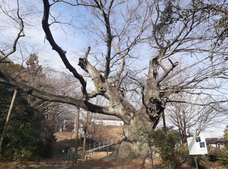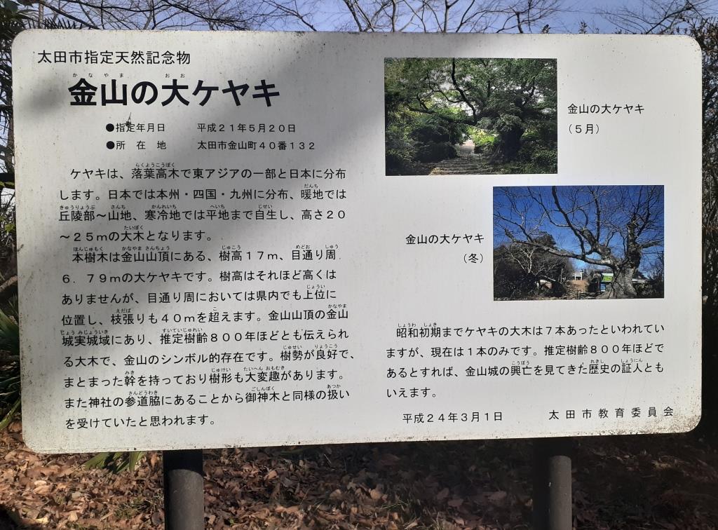 昭和初期までケヤキの大木は7本あったといわれていますが、現在は1本のみです。推定樹齢800年ほどであるとすれば、金山城の興亡を見てきた歴史の証人ともいえます。