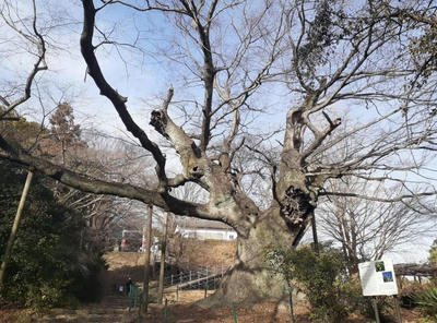 金山山頂の金山城実城域にあり、推定樹齢800年ほどと伝えられる大木で、金山のシンボル的存在です。樹勢が良好で、まとまった幹を持っており樹形も大変趣があります。