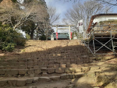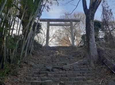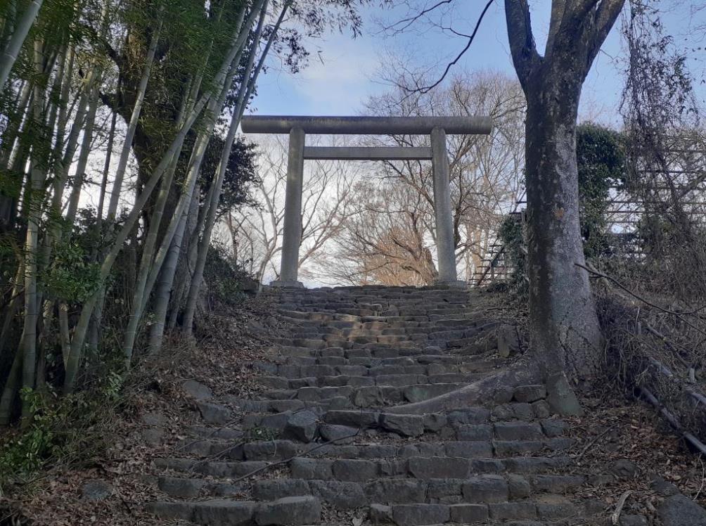 金山の大ケヤキのすぐ先に石段があり、登り終えた正面に神明系の鳥居が建つ(写真左・右)