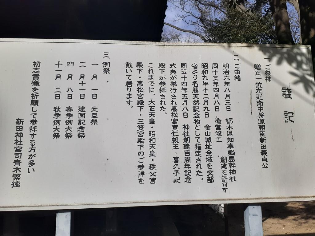 金山町新田神社自体が、金山城跡の一角に鎮座していることから、境内には社関連の石碑・案内板等は勿論であるが、金山城に関するものも多く設置されている。
