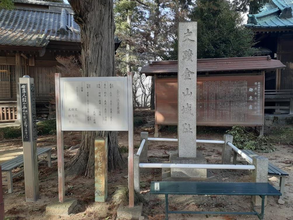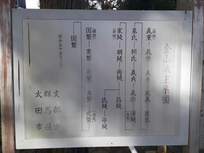 境内に設置されている金山城主系図 系図の右側にある「史跡 金山城址」の標柱