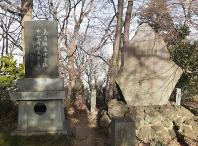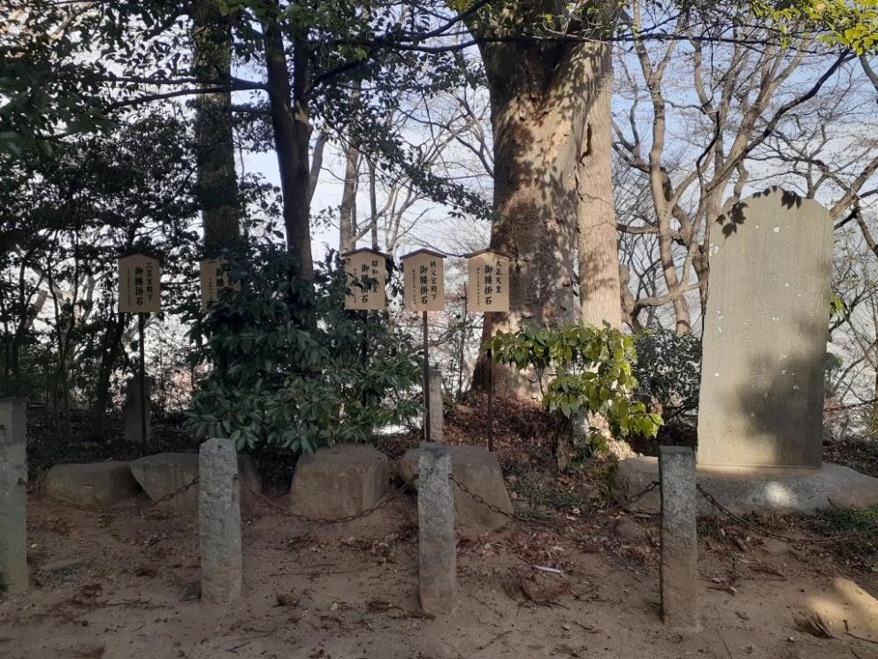 ご皇室の方々が腰掛けた石が展示されている。 腰掛石の右側にある社の由緒碑等