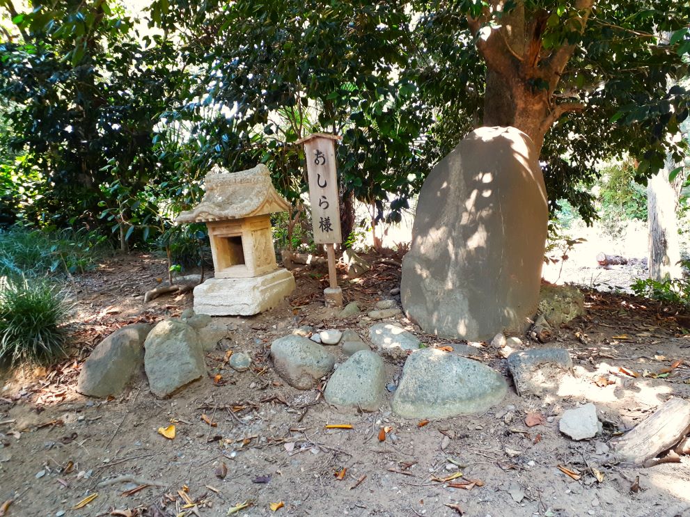 本殿を左方向からぐるっと回る。すると「鬼石」の名前の由来となった石が本殿の床下にあるという札が貼ってある。但し遠間から見る為筆者には暗くてよく見えなかった。