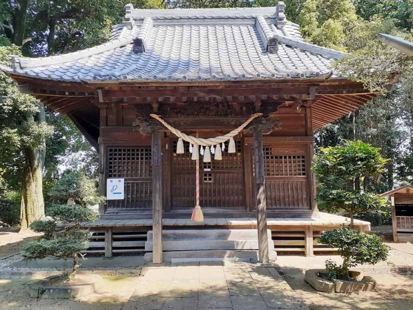 拝殿は正面3間、側面2間、入母屋瓦葺、1間向拝付き平入で軒は二軒半繁垂木とする。彫り物は水引虹梁に絵模様、上に龍、獅子鼻が彫られている。建築様式から、建造年代は江戸末期、19世紀後期とみられている。