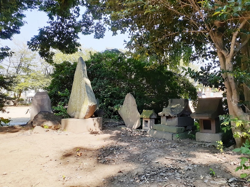 拝殿左側に祀られている境内社・石祠等(写真左・右)右側の写真の石祠・石碑は八坂神社。
