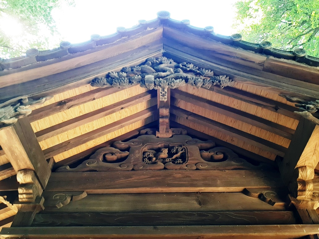 向拝部の両端に位置する木鼻部位にも見事な彫刻が施されている(写真左・右)