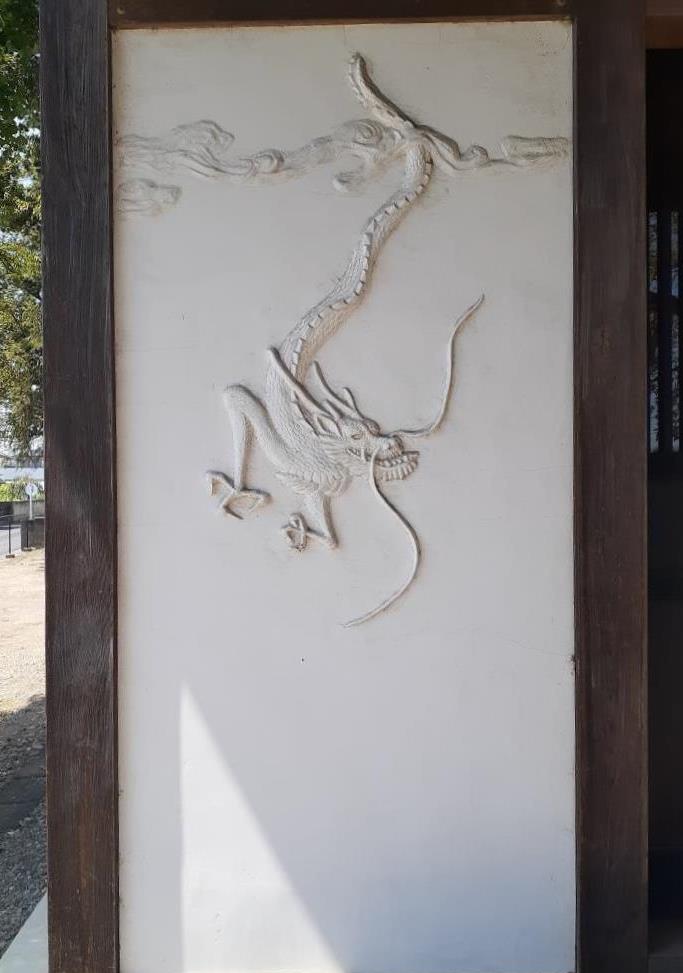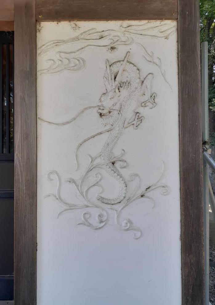 向拝部・木鼻部には精巧な彫刻が施されている。 由緒書きが奉納、ほとんど読み取れなかった。
