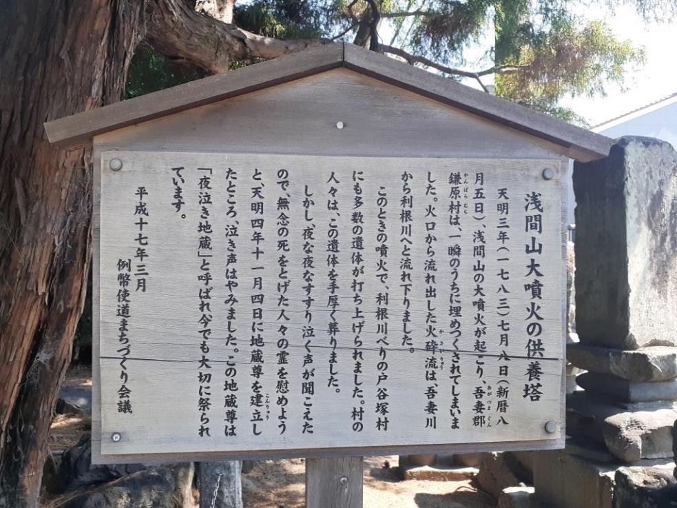しかし、この利根川は、たびたび洪水を起こすため新水路として、一部の水を現流路に沿い流した。この流路を三分川、前述の流路を七分川と呼んだ。しかし、天明3年(1783)の浅間山大噴火により七分川には、 水が流れぬようになり、三分川が主流となった。今でも柴宿西岸に小さな段丘崖を確認することができ、南には旧流路(七分川)であった低湿地が帯状にみられる。江戸中期項まで柴宿は、現地点より南方200〜300 mにあった。このため柴宿は、たびたび洪水に見舞れたのであろう。享保年間(1716~35)に、その地点より標高の高い今の地域に、村内の有力者たちが町割りを計画的に作りはじめ、その後の洪水で移ったという。今でもこの地域のいたるところに浅間山の溶岩と思われるものが見られ、浅間大噴火の規模の大きさが想像されよう。