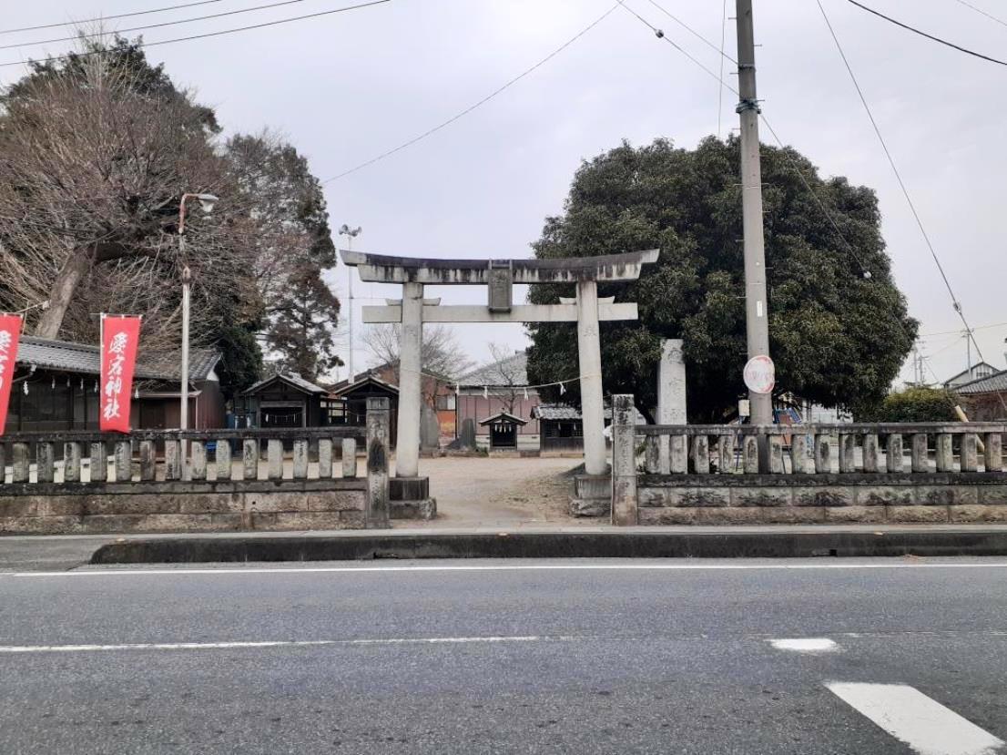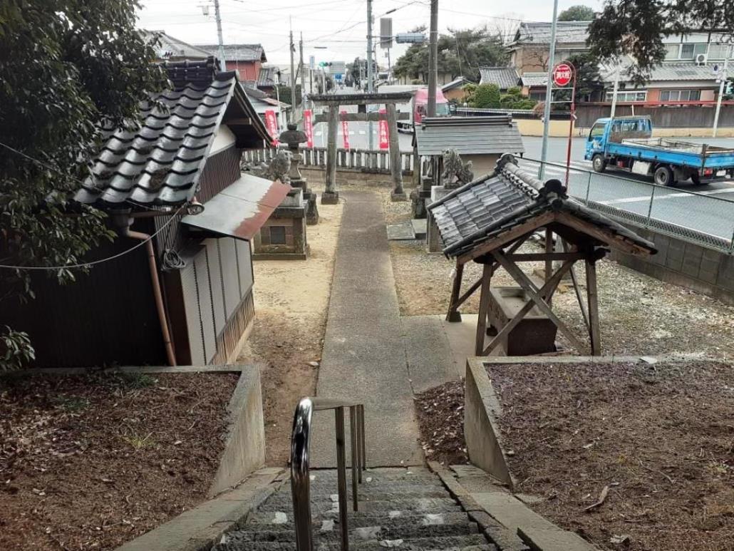この交差点は社が丁度出っ張り部となっていて、二の鳥居から南側には県道が通っている。