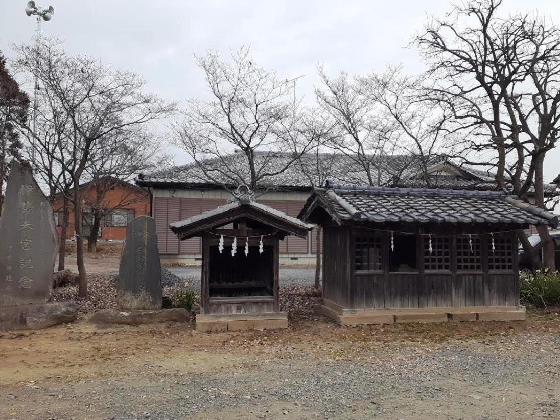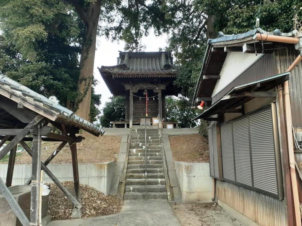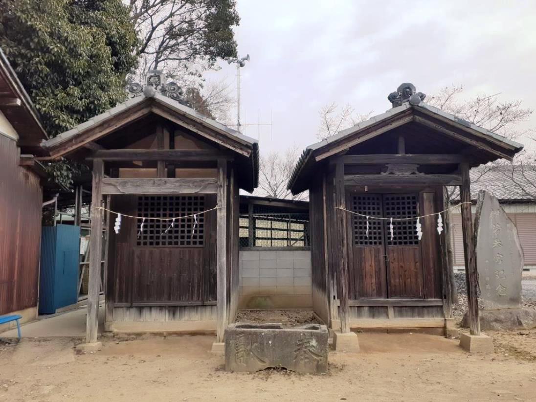 石段を下りると、すぐ左側には社務所があり、その隣に境内社が横一列に並び、祀られている。