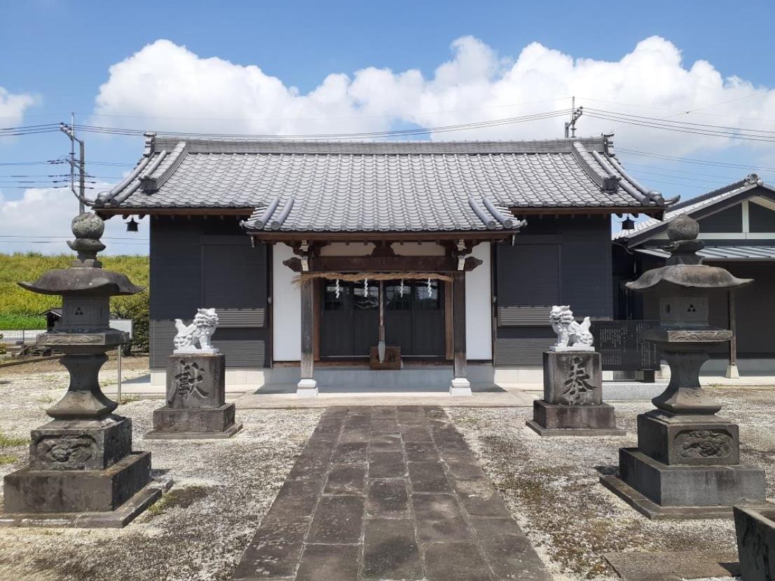 発戸鷲宮神社から用水路沿いの道路に北行して戻り、合流後右折する。仰ぎ見れば、鮮やかな青色の夏空の中、綿菓子のような雲とのコントラストが見事なまでに盛夏の雰囲気を醸し出している。運転をしながらふと左手を見ると、そこには利根川の堤防が東西に延々と続き、周囲は長閑な水田地帯が広がる中、700m程先にある丁字路を左折すると、利根川の堤防が見えるその南岸に真新しい上村君避来矢神社が見えてくる。