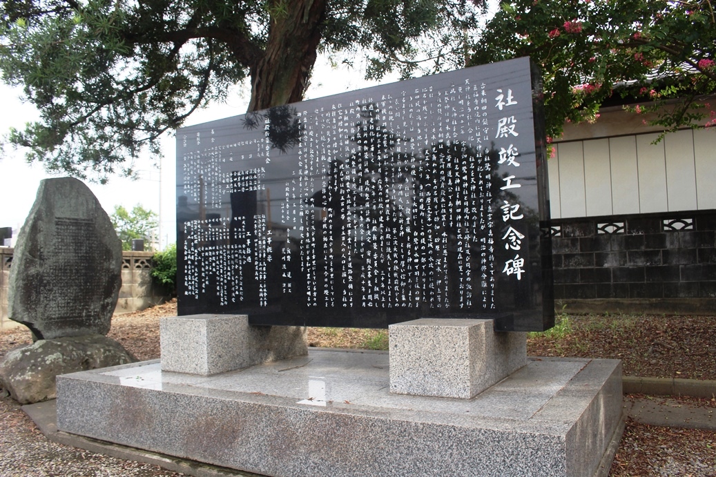 時代の幾多の変遷にもかかわらず、町内の方々及び当町を古里にしている方々の今に続く清純な神社崇拝の心と、浄財の拠出によって今日の竣工を迎えることができました。ここに竣工を記念するにあたり、町内の方々及び当町を古里にしている方々の隆盛を祈念し併せて当神社を心のより処として当地区が平和で豊かな明るい郷土として末永く発展することを念願し碑文といたします。
