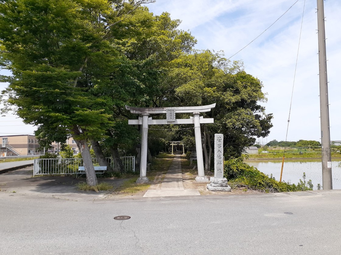 佐谷田神社から埼玉県道128号熊谷羽生線を行田市街地方向に1.7㎞程進み、「流通センター前」交差点を左折する。秩父鉄道の踏切を過ぎて400m先の十字路を右折して、暫く進むと左手に菅谷八幡神社の社叢林が見え、その林の先に鳥居が見える。