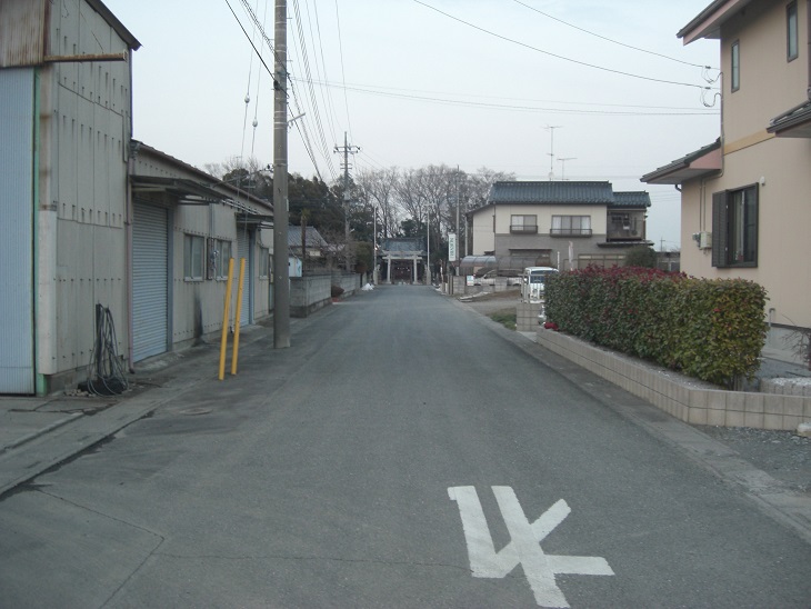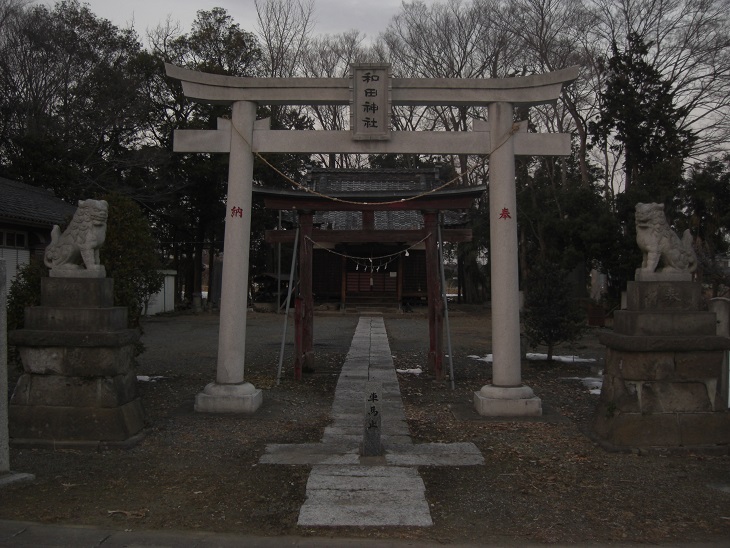 とにかくこの埼玉県道128号線を道なりに真っ直ぐ進むと約10分くらいで左側に和田神社の社号標が見えるT字路があり、そこを左折すると、正面突き当りに和田神社の鳥居が見えてくる。