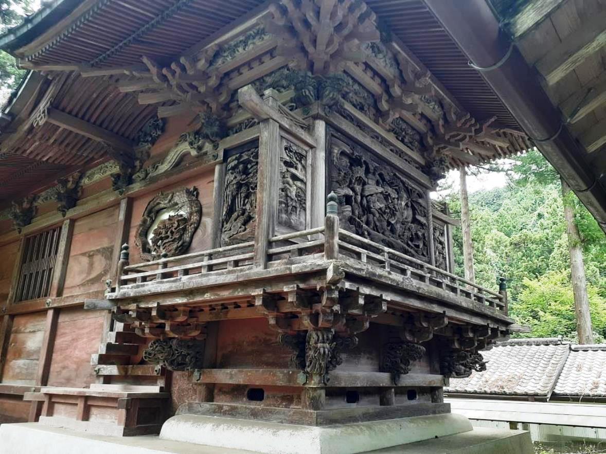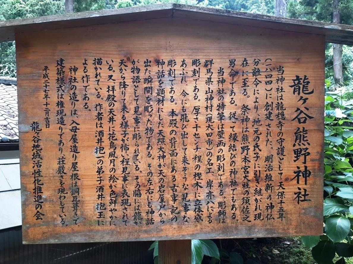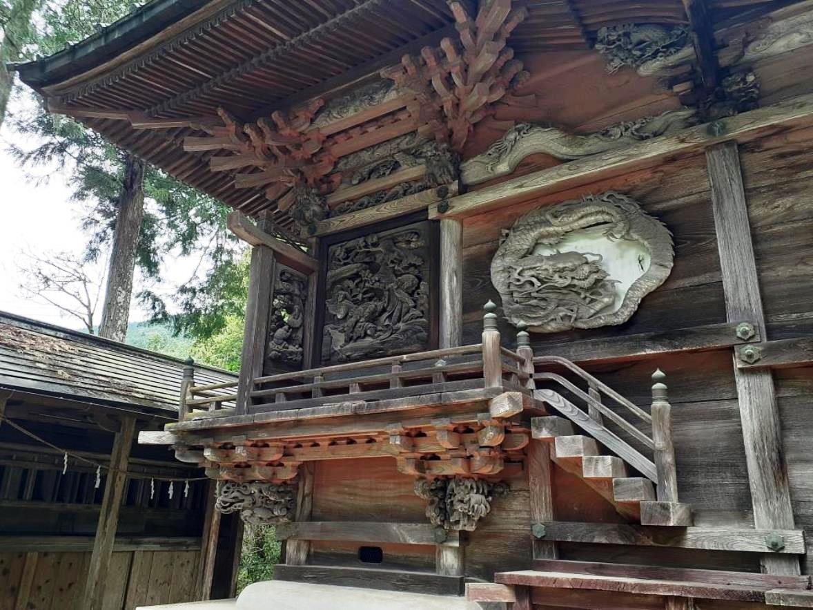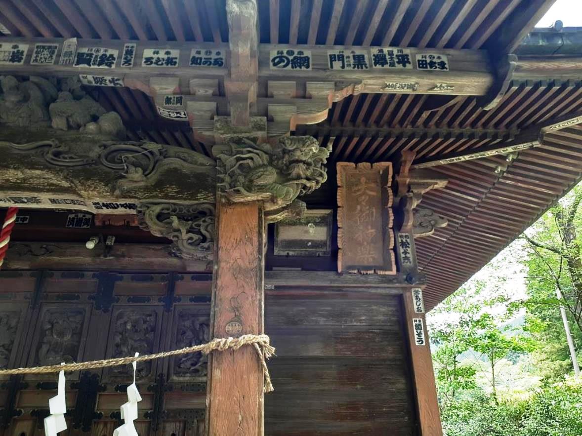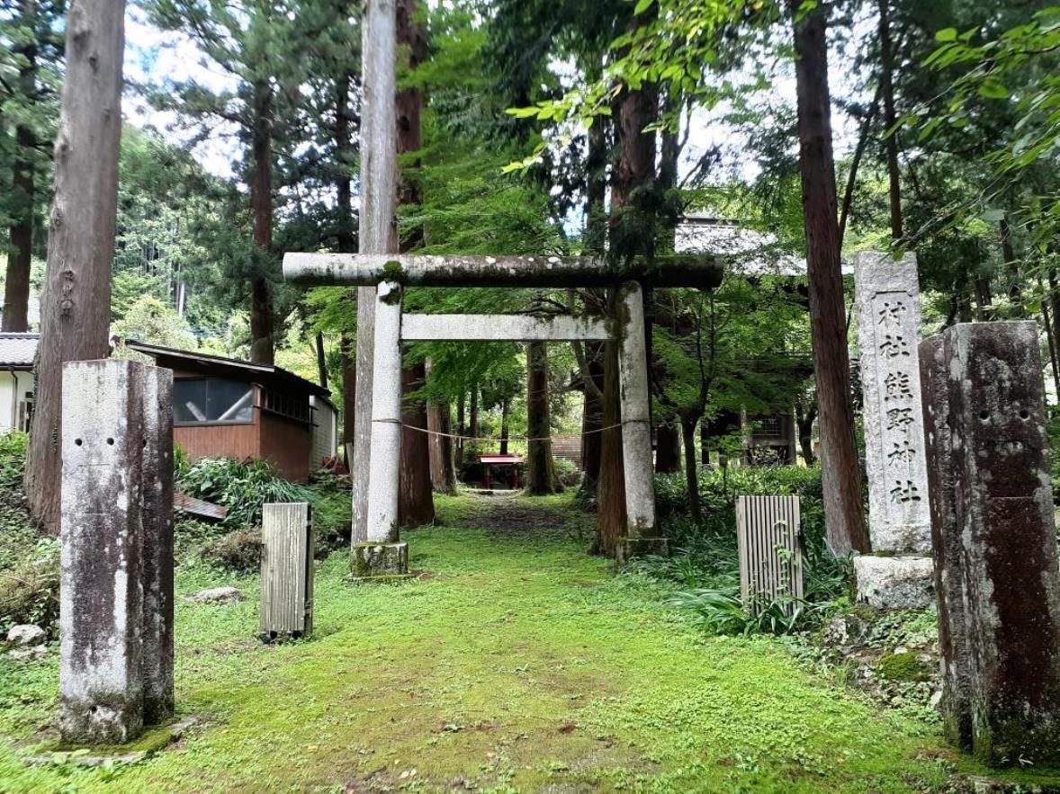 この社の前に参拝した龍ヶ谷熊野神社の印象は、人が日々織りなす喧噪から完全に隔絶された別次元の世界が広がり、社全体を囲む深き森と、苔生した様が何とも幻想的な石段、そして規模は小さいながらも随所に精巧な彫刻が施された立派な社殿が相まって、周囲一帯に広がる閉鎖的な暗がりの世界が、逆に社の神聖性・荘厳さを増長する演出がされているのに対して、黒山熊野神社は、同じく深い森には囲まれているが、県道周囲が民家も立ち並び、観光地化もなされていて、社周辺は明るい雰囲気が広がっている。おそらくは、「黒山三滝」の玄関口にあたる場所に鎮座している関係もあるのであろう。