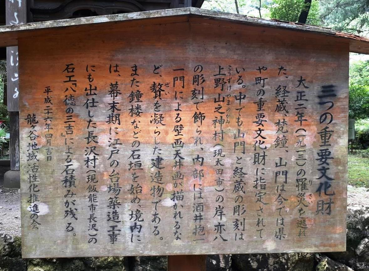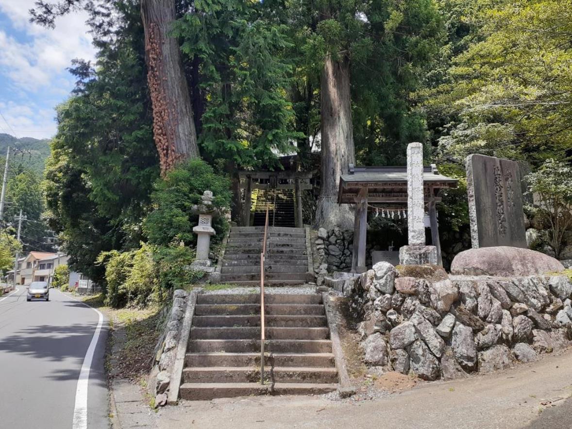 石段手前で右側には道路に面して広い空間が広がり、そこには社務所らしき建物2棟あり、(写真左)また町で設置されているステンレスプレートもあった。(同右)