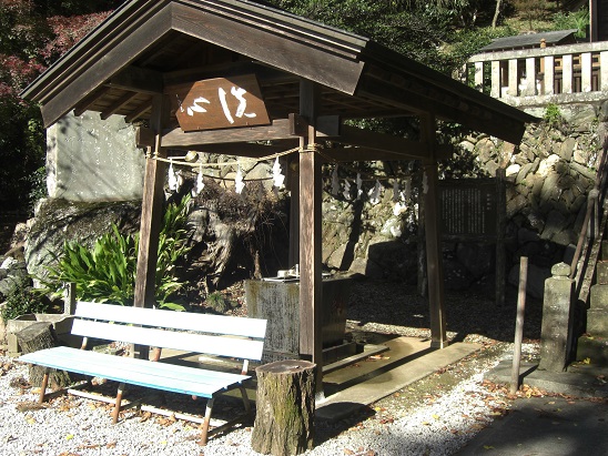 社殿前にある石段の左側にある手水舎             手水舎の奥にある案内板