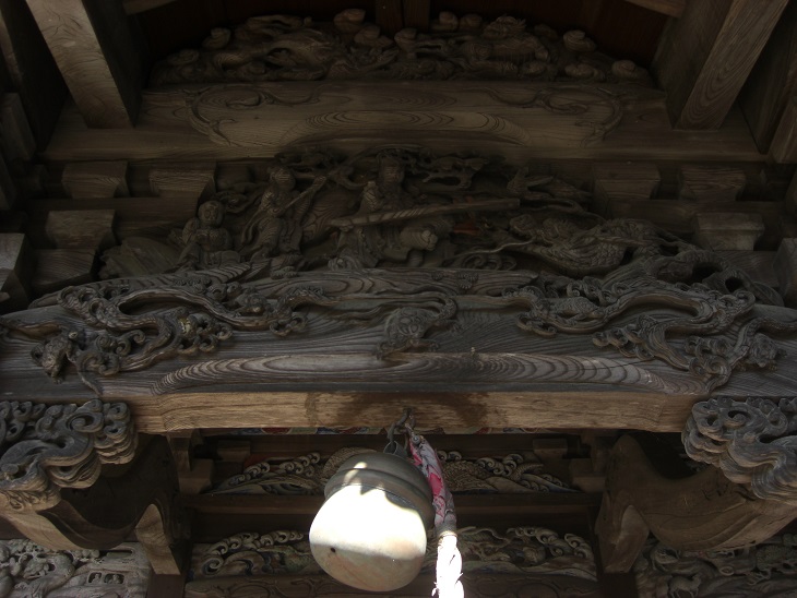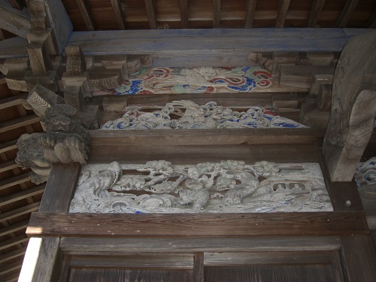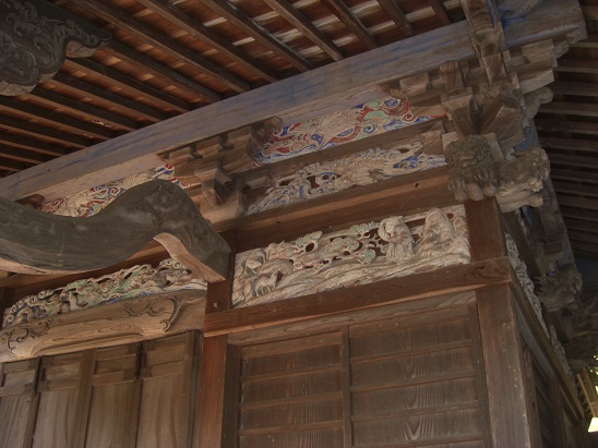 若干色彩が残っている場所もあるが、その全体像までは解らない。この彫刻は拝殿側面部にまで施されている。野上下郷地区という正直閑散とした地にこの素晴らしい社が存在すること自体、驚きという以外ない。