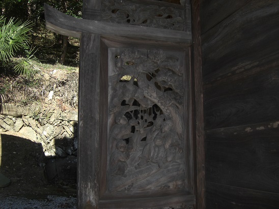 拝殿の脇障子にも細かく多彩な彫刻が施されている。