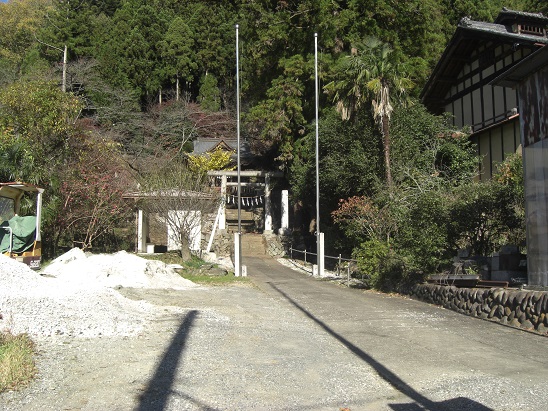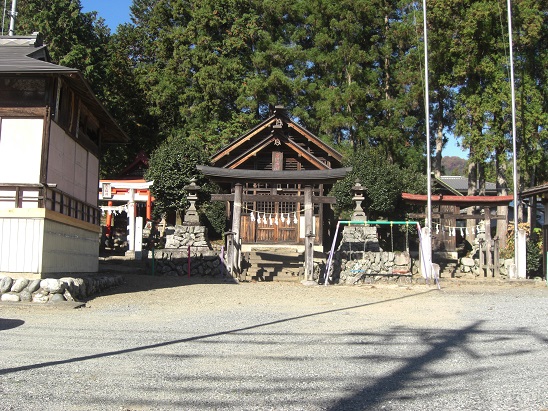 野上下郷石上神社は国道140号線を長瀞町方向に進み、中野上交差点を右折し、群馬・埼玉県道13号前橋長瀞線に入り、1.2km程で諏訪沢と呼ばれる荒川支流を渡ってすぐV時の逆Y字路を折り返すように右折すると、約400mほどで左側に鎮座している。社殿が3社並んで鎮座していて、中央に石上神社、左右に境内社光玉稲荷神社、同じく八坂神社が鎮座している。社殿の東側には広い空間があり、その正面に向かって右側には社務所がある。その広い空間の一角に車を停めて参拝を行った。