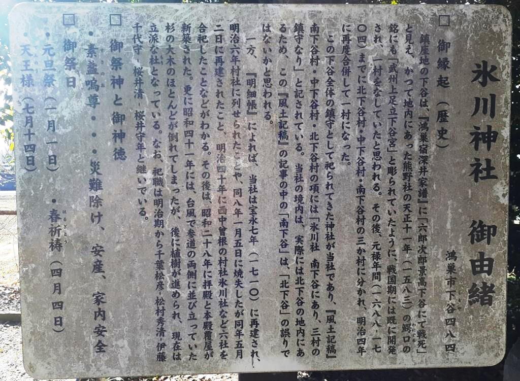 この下谷全体の鎮守として祀られてきた神社が当社であり、『風土記稿』南下谷村・中下谷村・北下谷村の項には「氷川社 南下谷にあり、三村の鎮守なり」と記されている。当社の境内は、実際には北下谷の地内にあるため、この『風土記稿』の記事の中の「南下谷」は、「北下谷」の誤りではないかと思われる。