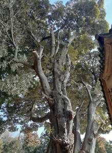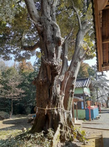 社殿右側奥に聳え立つご神木(写真左・右)。鴻巣市指定保護樹木。