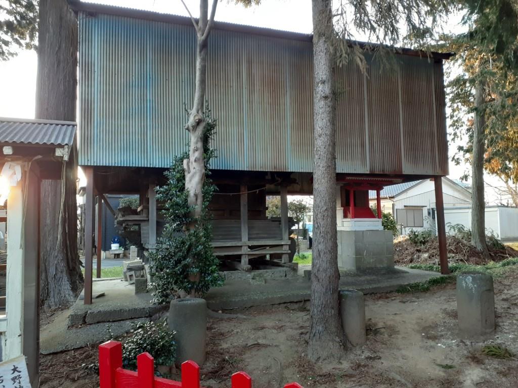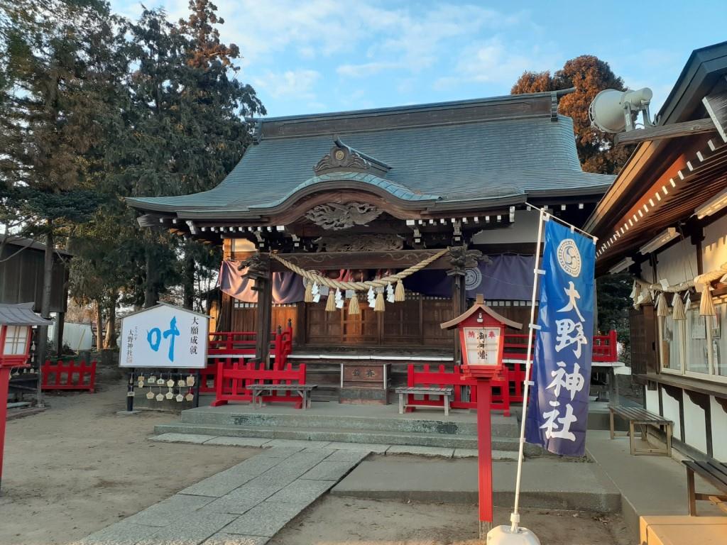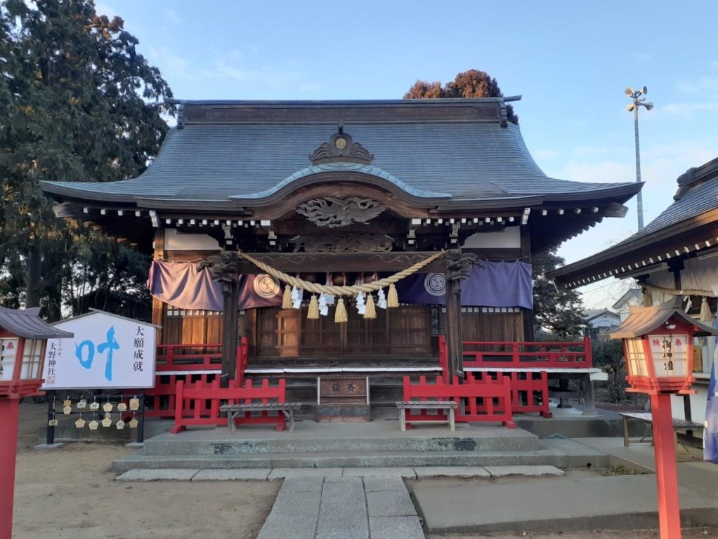 鴻巣市大間鎮座の社。今は住宅街の真ん中にひっそりと佇むこじんまりとした神社。元は氷川神社であり明治時代に大間地内の五社を合祀、北長野地内の四社を合祀。大間、中野地区の字を使い、大野神社と定めた。