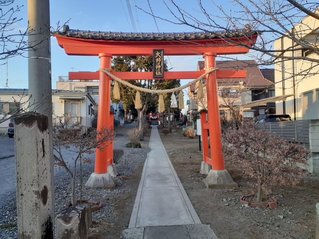 周囲は住宅とビルの立ち並ぶ道路となり、交通量も多く、対向車両や自転車、徒歩での方々の往来にも気を付けながら200m程進むと「氷川山・大野神社」の看板が進行方向正面右側に見えてきて、そこを右折すると大間大野神社の鳥居、及び参道が見えてくる。