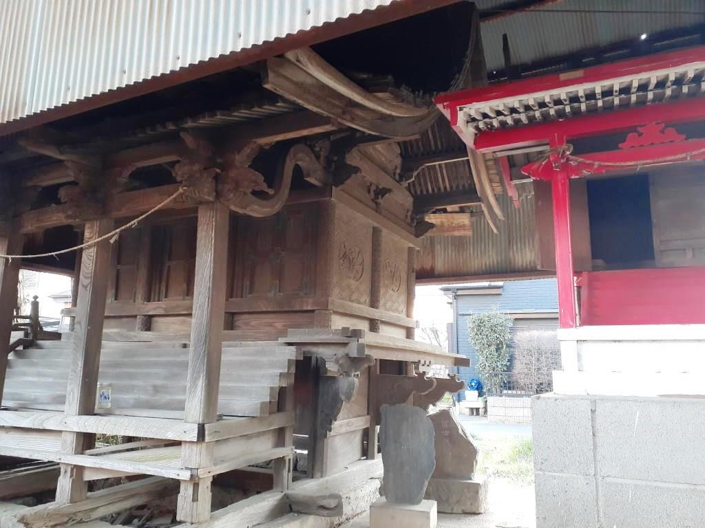 境内社2社の並びにある石祠群と屋根付き母屋の境内社(写真左)。石祠は左から「不明、八幡宮、八幡宮」と読める。右側に鎮座する母屋付きの境内社(同右)は、扁額らしい額はあるが、薄すぎて解読は不可能。但し本殿奥に鎮座している所から推測すると、旧本殿の可能性も否めない。