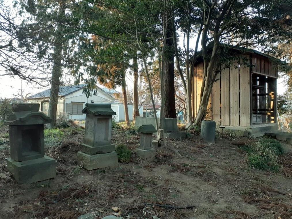 社殿左側に鎮座する境内社2社。詳細不明。 境内社内部を撮影。2社の間にある石祠は