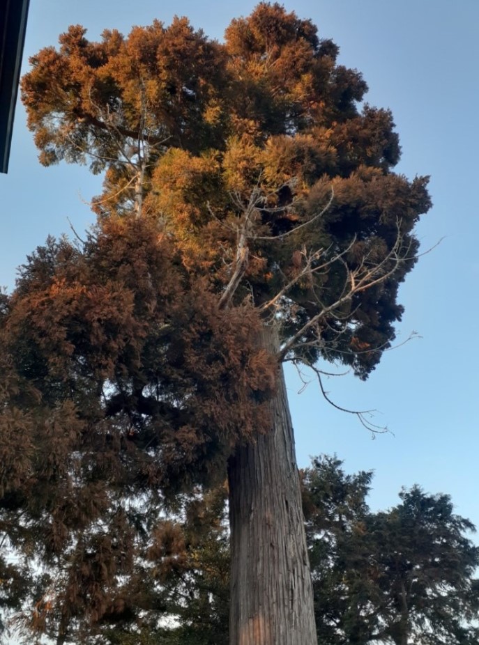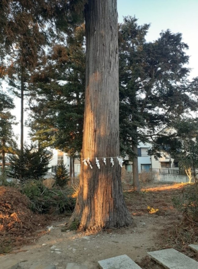 社殿右奥に聳え立つご神木(写真左・右)