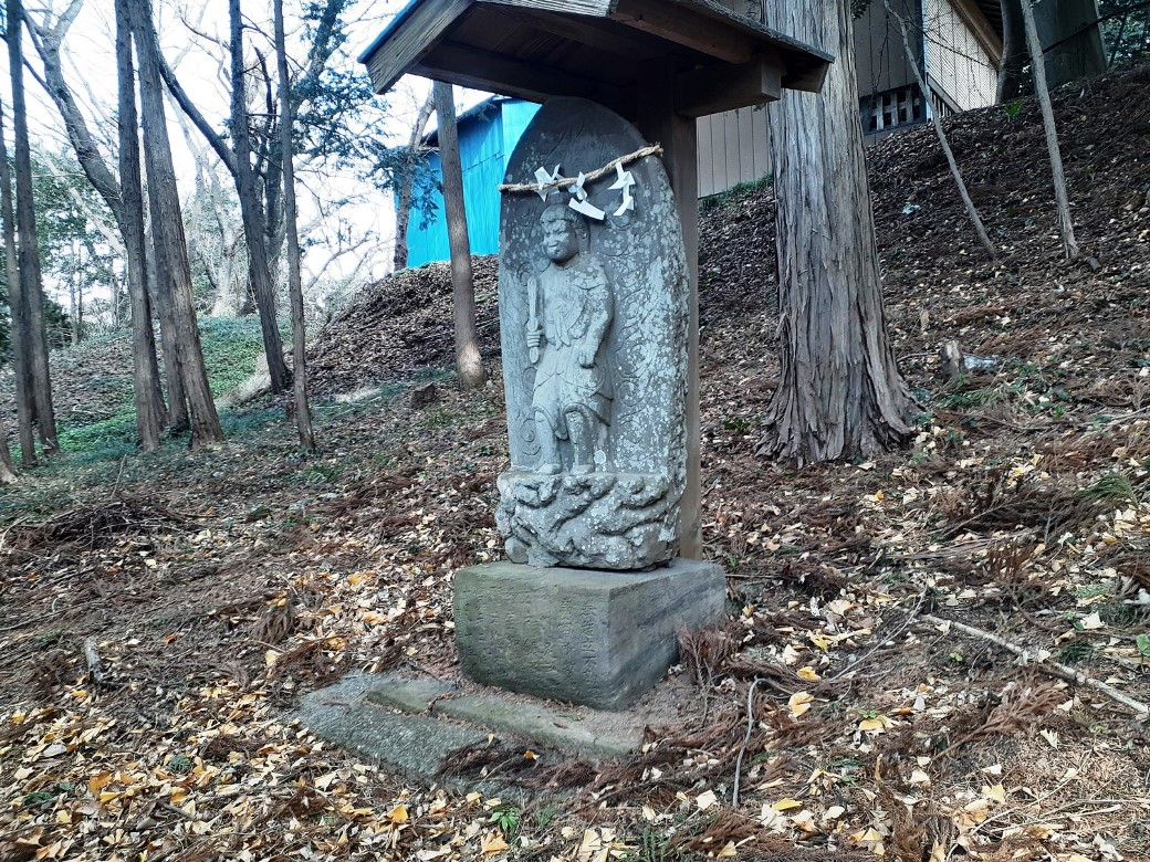 石段の左側で斜面上にある不動明王(写真左)と紙垂の巻かれた石柱(同右)。