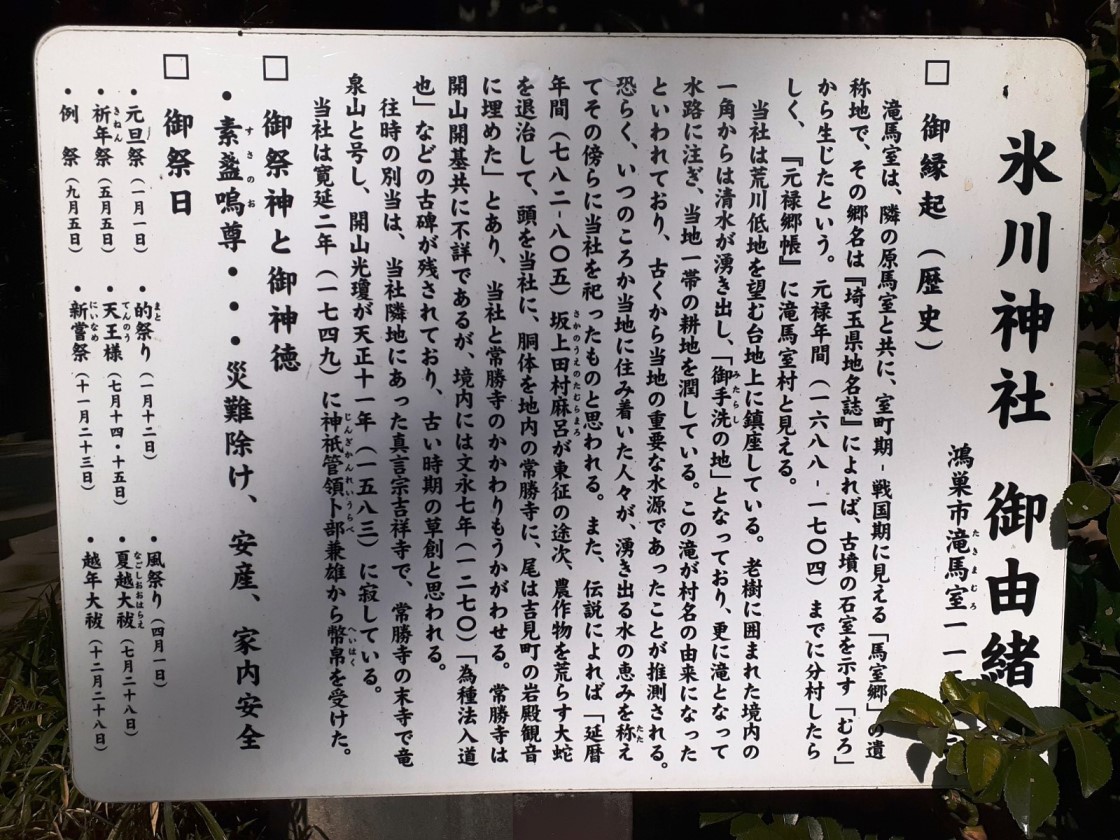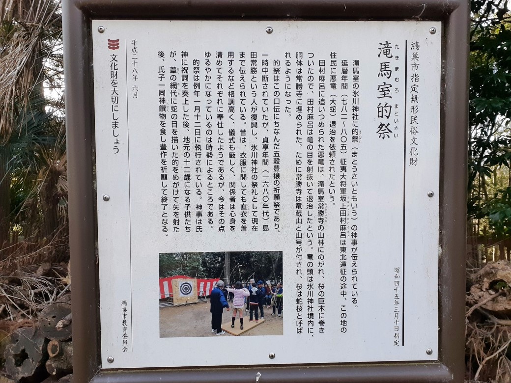 滝馬室氷川神社は「鴻巣市指定無形民俗文化財 滝馬室的祭」神事が当地の五穀豊穣の祈願由来となり、毎年続けられている地元に根付いた行事でもある。