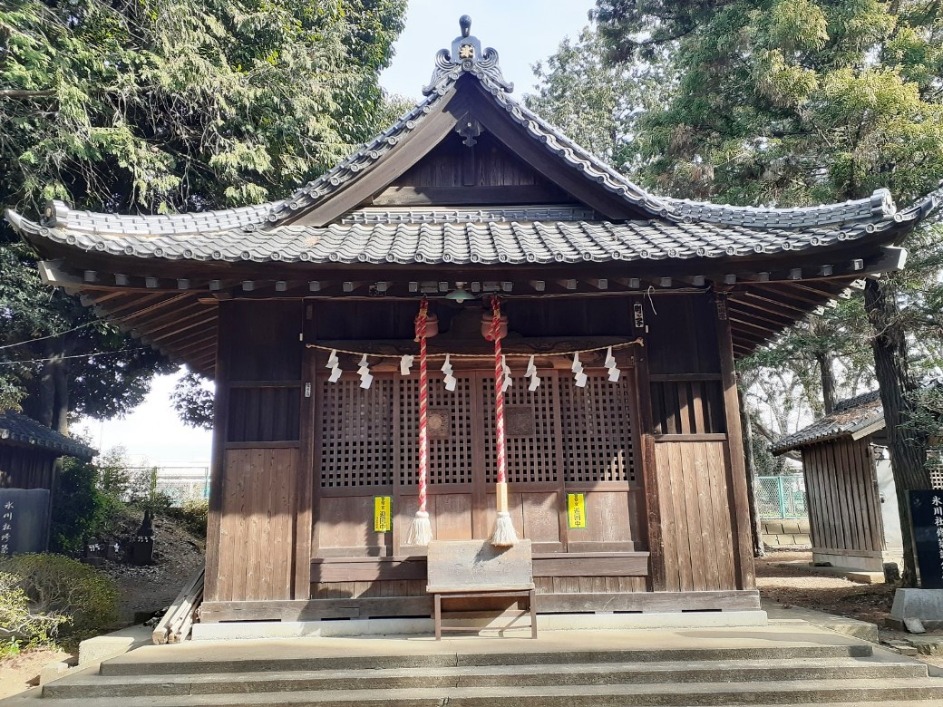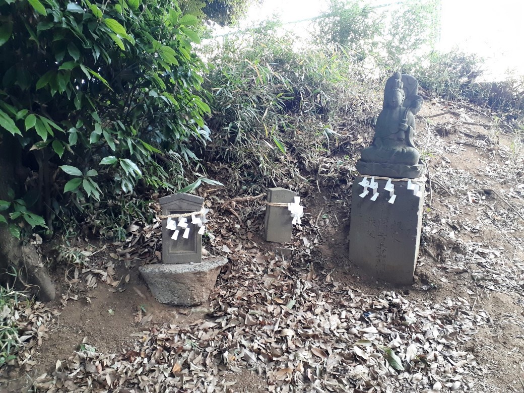 拝殿左側に鎮座する境内社・須賀神社。 須賀神社の奥にある石碑、菩薩様等。