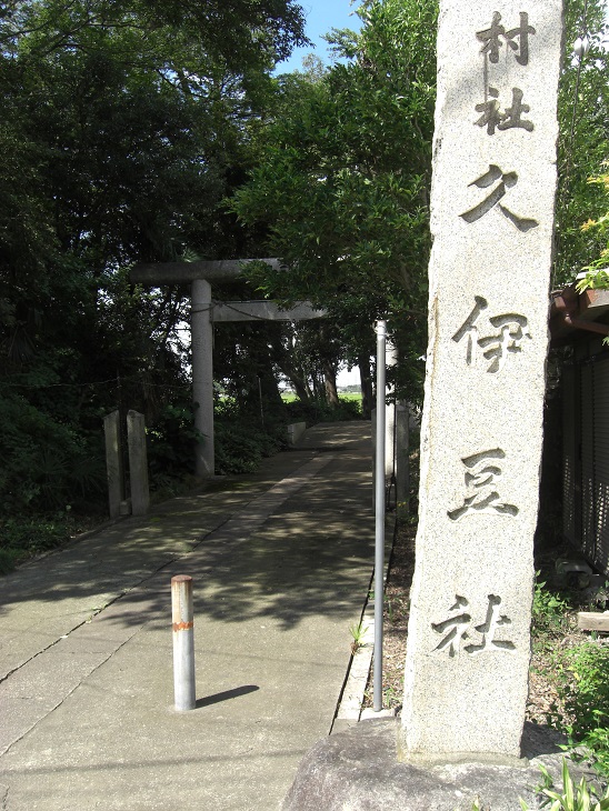 村社 久伊豆神社の社号標。斜めに傾いている。その先に神明系の鳥居がある。
