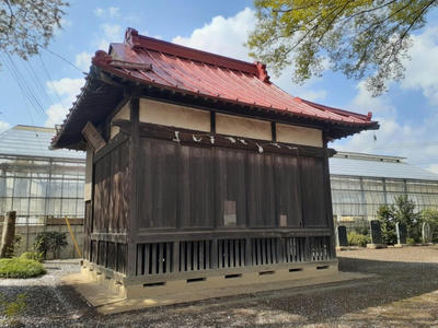 この社の最大の特徴は拝殿の奥の本殿が愛宕山古墳、つまり墳頂上にあることだ。愛宕山古墳は、直径20~30m、高さ3m程の古墳時代後期の円墳と推定されているが、出土品などが確認されていないため、塚の可能性もあるという。 墳頂には愛宕神社が祀られていて、周りはコンクリートで固められ墳形は大きく変形していて原形を留めていないように見える。ちなみにこの愛宕山古墳は昭和34年1月16日鴻巣市指定史跡に指定されている。