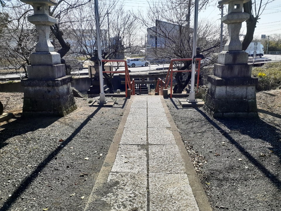 県道から「天神橋」交差点に合流する手前に右折する道路があり、すぐ左側には専用の駐車スペースも確保されていて、そこの一角に停めてから参拝を行う。