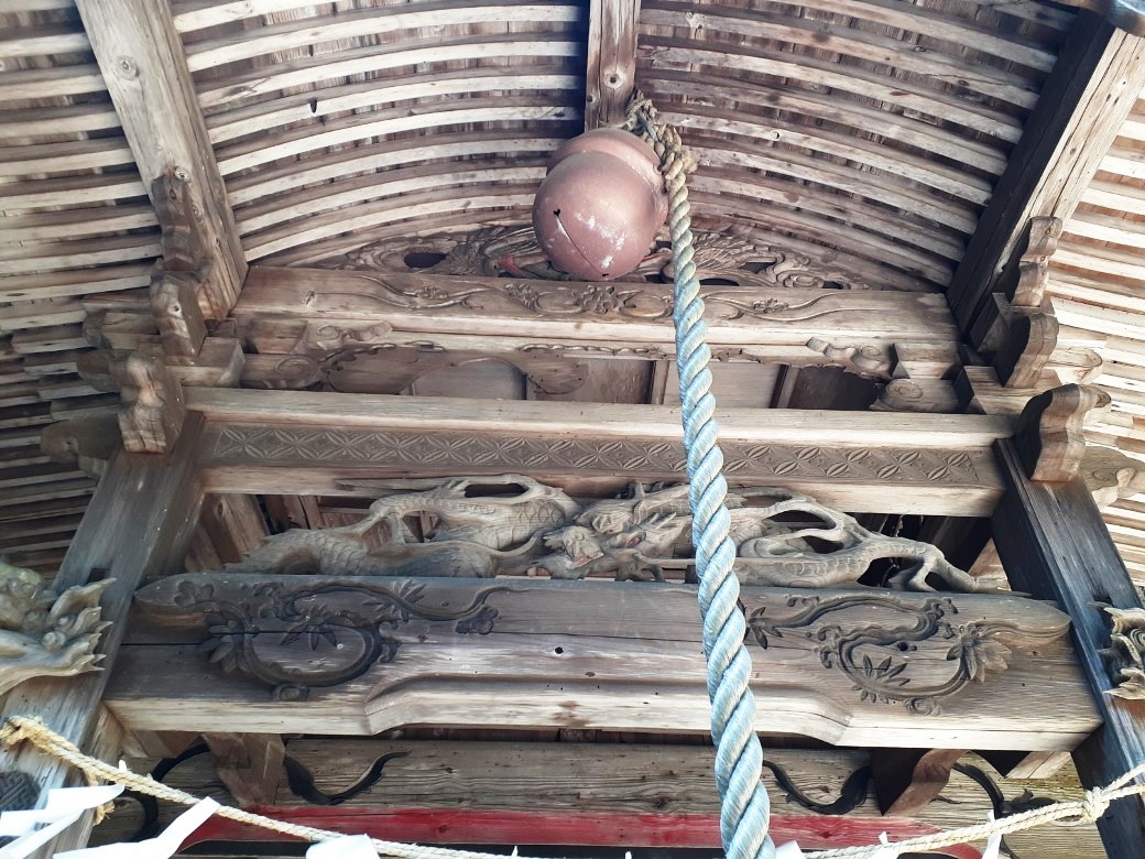 拝殿奥には小さな本殿部があり、その奥には丘陵地面を堀り、岩盤がむき出しになっている。境内は可能な限り平坦部を選んだのであろうが、それでも基礎工事を行い、山の丘陵地面をなだらかにするため、多くの人的な労働力を用いたのであろう。