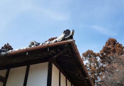 参拝を終えて何気に振り返ったところ、瓦に不思議な紋があった。「菊水紋」である。