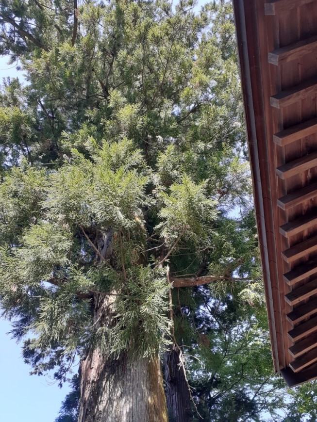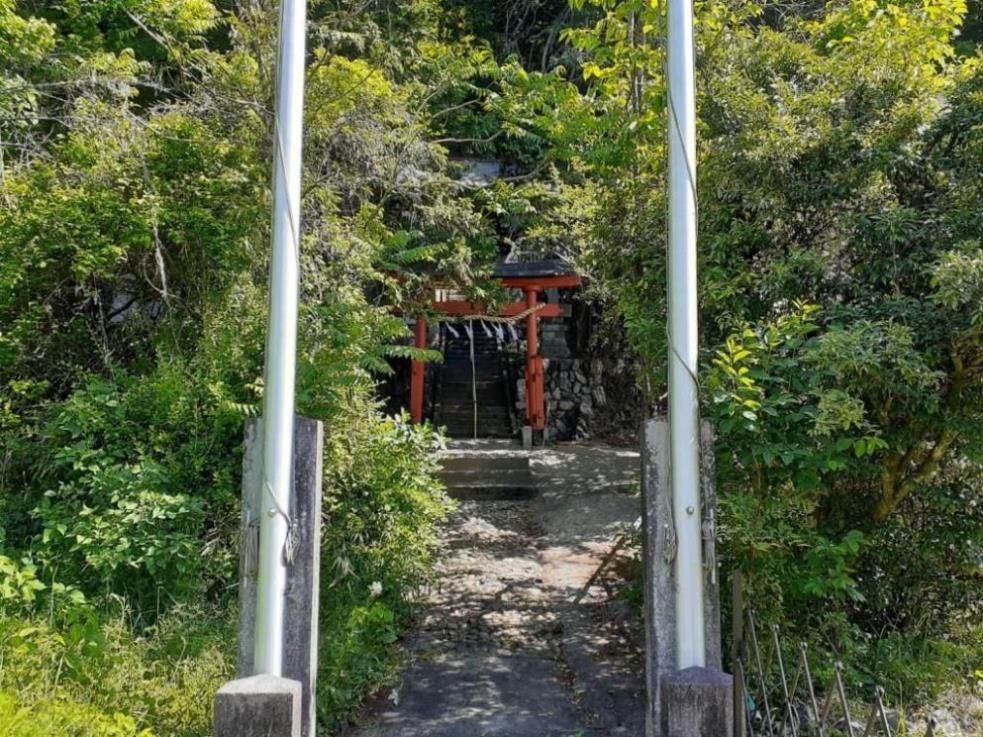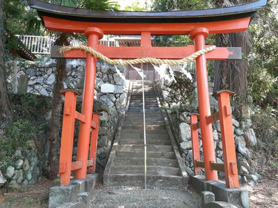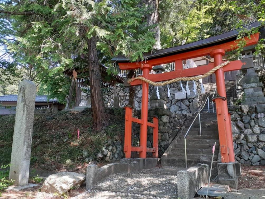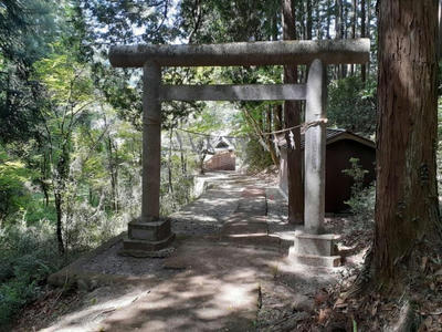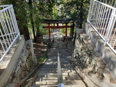 社務所から正面の山道を登らず、社務所から右側にある石段がない坂を利用して社に向かう脇道もあった。そこにも坂の途中には鳥居が出迎えてくれた。