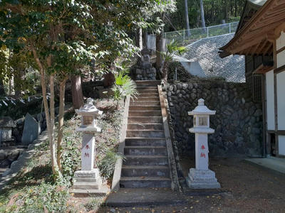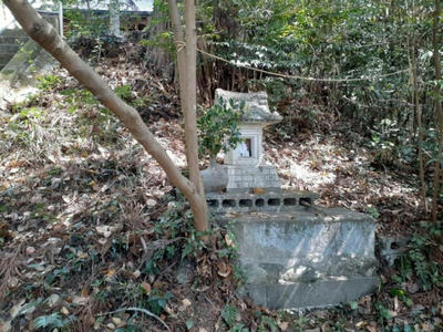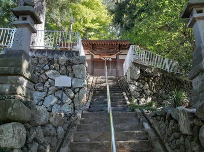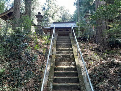 勾配のある石段を登り終えた先に拝殿が見える。 石段上る途中、右側にひっそりと佇む石祠。